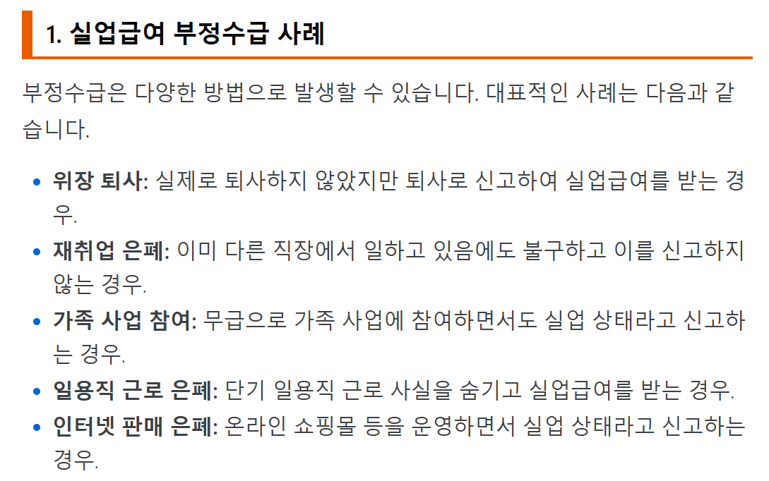 - 고용보험법 제116조: 거짓이나 부정한 방법으로 보험급여를 받은 경우 → 5년 이하 징역 또는 5천만 원 이하 벌금